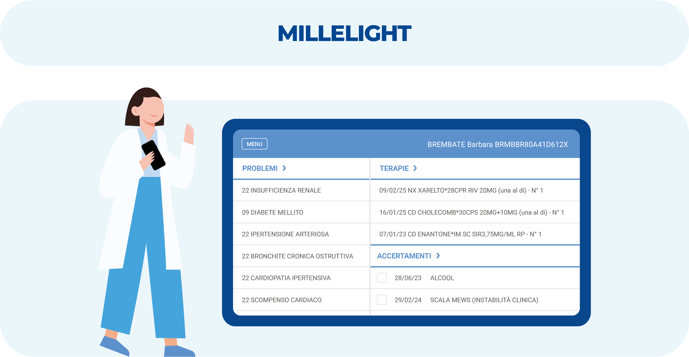 L’architettura dei nostri software è progettata per rendere l’accesso allo storico clinico immediato, intuitivo e senza barriere fisiche. Grazie al nostro servizio, Millelight, la consultazione della scheda paziente diventa fluida e veloce non solo all’interno dello studio, ma anche in mobilità. Questa libertà operativa assicura al Medico la disponibilità del dato clinico ovunque si trovi, permettendo di dedicare ogni istante a ciò che conta davvero: la cura e la relazione con il paziente.